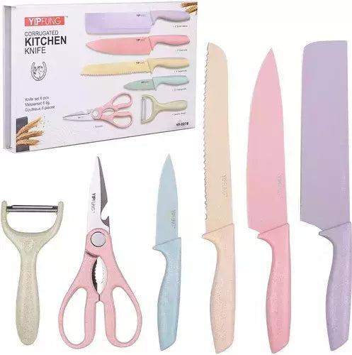 • Se despacha un set de 6 piezas: 1 cuchillo de Chef, 1 cuchillo para pan, 1 cuchilla pequeña, 1 cuchillo de pelar, 1 tijera y 1 pelador de cerámica.